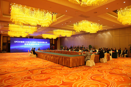11月1日下午,OPCW组织视察江苏蓝丰生物化工股份有限公司签字仪式在新沂戴斯酒店举行。相关国家、省、市、新沂市领导及禁化武专家,公司董事长杨振华、总经理刘宇等出席会议。国家代表付海东主持会议并简要介绍本次核查过程及核查报告情况,视察领队加布里埃尔、江苏省工信厅副厅长、江苏省禁化武办主任高清、徐州市政府办公室副主任黄立超、新沂人民政府市长陈堂清、公司总经理刘宇先后讲话。刘总在讲话中首先代表公司对两位视察员不顾旅途疲劳,克服时差,在视察期间表现出严谨、高效的工作作风和高度的敬业精神表示由衷的敬意!对国家、省、市、新沂市领导及相关部门和各位专家在此期间给予的帮助表示诚挚的谢意!