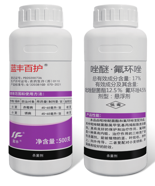 吡唑醚菌酯属甲氧基丙烯酸酯类杀菌剂,具有良好的保护和治疗作用。氟环唑是一种具有内吸、治疗作用的三唑类广谱性杀菌剂,能被植物的茎、叶吸收,并向上、向外传导。二者复配对小麦锈病、赤霉病以及玉米大斑病有较好的防效。